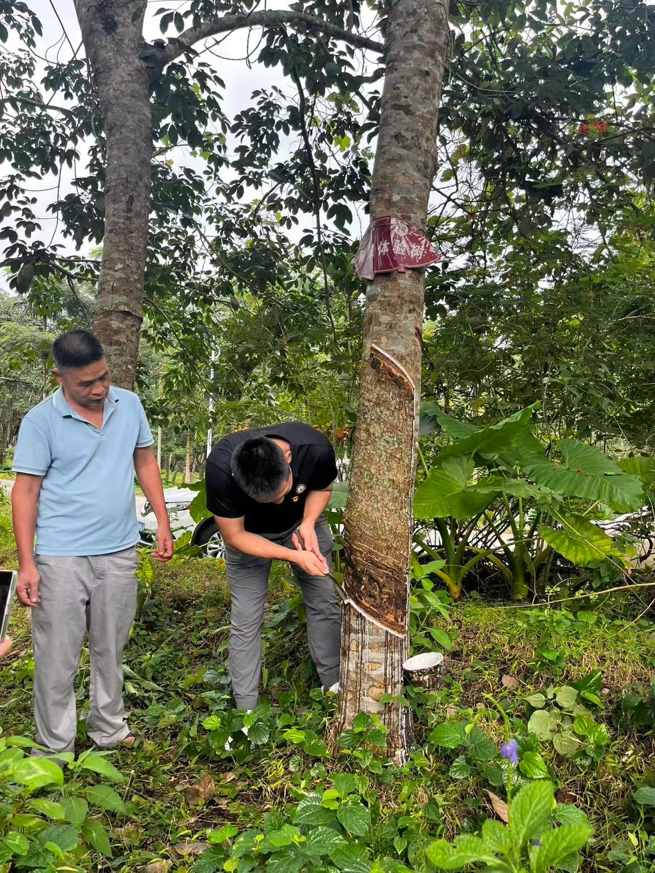 次日,党员们前往联昌教育基地。原两院离退休工作处处长陈海青为党员们带来题为“应国家战略而生,为国家使命而战”的专题党课。他深情讲述了1958年何康老校长创办热作两院,为打破美帝国主义经济封锁、打破北纬18-24°不可能大面积种植橡胶神话的初衷。党课弘扬了“丹心耀南疆”的爱国奉献精神、“草庐创伟业”的艰苦奋斗精神以及“敢闯敢试”的改革创新精神,让党员们对中国橡胶科研事业的发展历程和重大意义有了更深层次的认识。在专业技术人员的指导下,党员们学习了割胶技术的基本要领,并亲自体验了割胶过程。